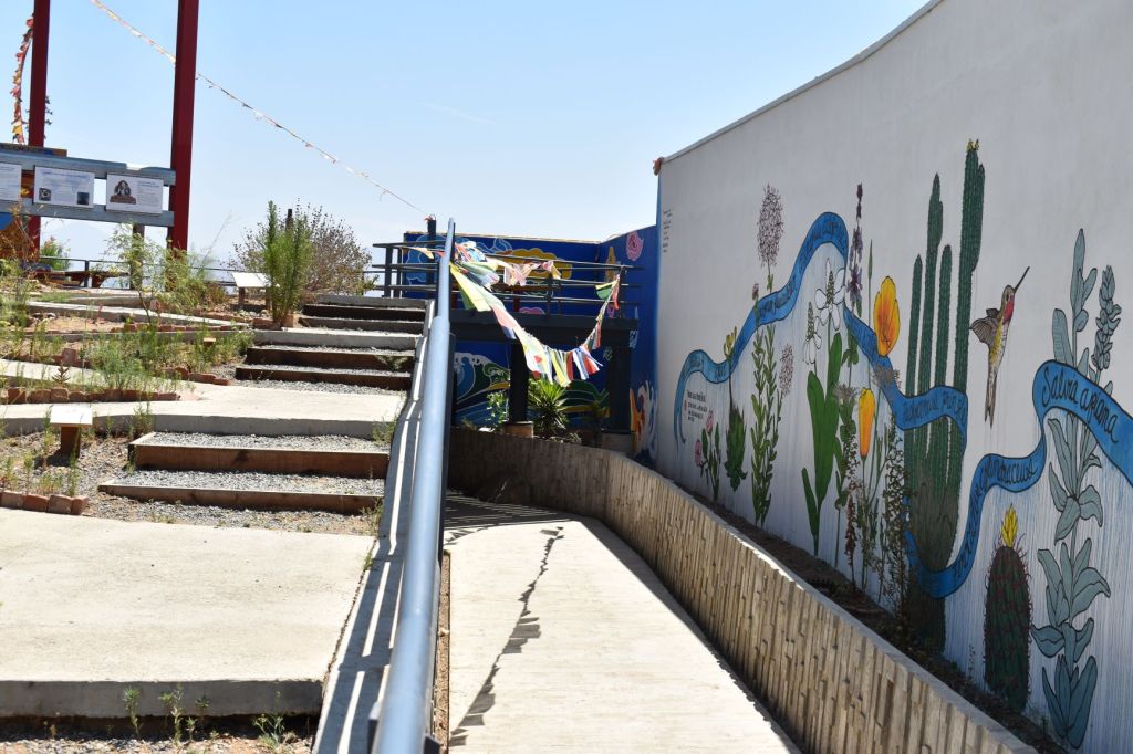 Las banderas enmarcan un hermoso mural realizado por Esther Gámez y Reyna Nájera en 2018 titulado “Madre Agua, Madre Tierra” que enuncia diversas plantas nativas, algunas de ellas las podrás encontrar en el jardín botánico del lugar.