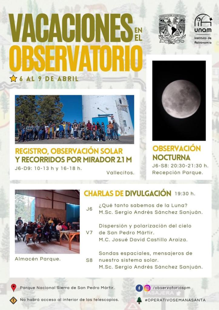 El Observatorio Astronómico Nacional Sierra de San Pedro Mártir, a cargo del Instituto de Astronomía de la UNAM, invita a las familias a participar en su Operativo de Semana Santa, que se llevará a cabo desde el jueves 6 al domingo 9 de abril.